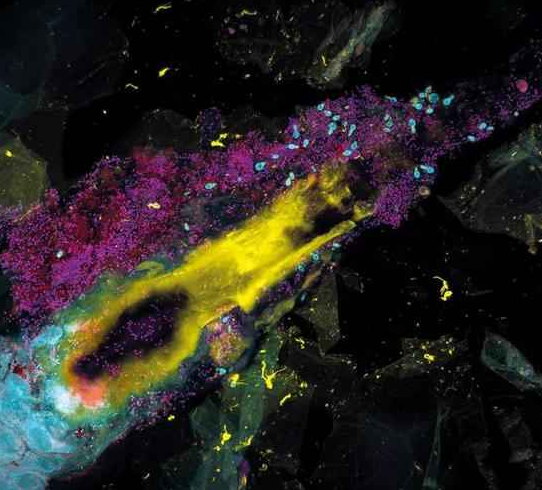 在人類皮膚中發(fā)現(xiàn)了金黃色葡萄球菌Staphylococcus aureus(圖中赤色和黃色)。