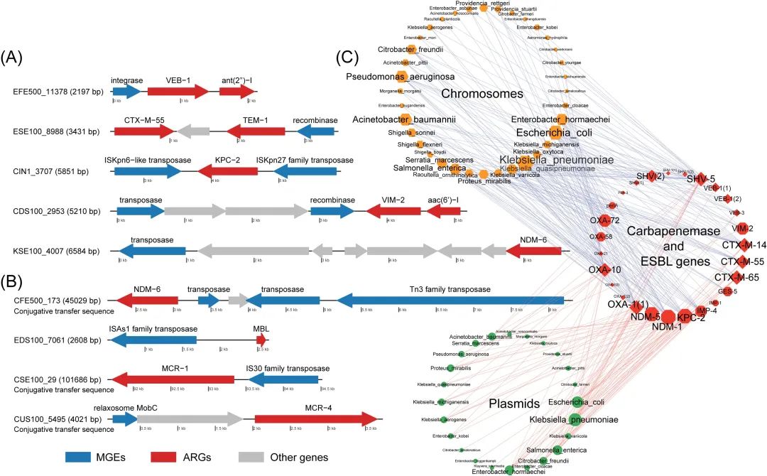 圖3. 項(xiàng)目組從污水樣本中獲取超廣譜抗生素耐藥表型微生物耐藥基因和可移動(dòng)基因元件的排列信息(A)和(B),其宿主細(xì)菌與臨床致病細(xì)菌之間共享了完全相同的超廣譜抗生素耐藥基因(C)。