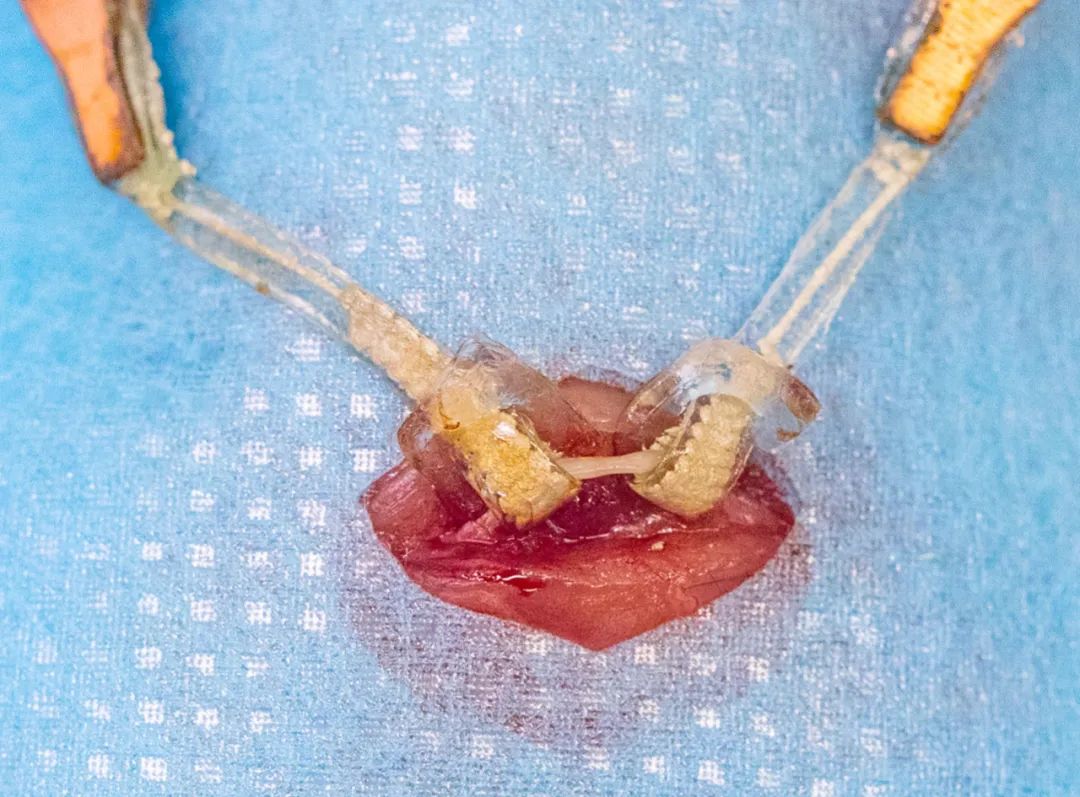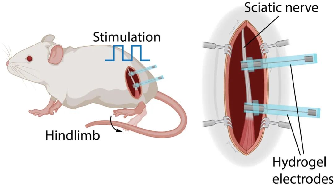 而這套方法的“終極目標(biāo)”,就是和生命體進(jìn)行直接的“連接”,而這一點(diǎn)也在小鼠實(shí)驗(yàn)上得到了非常成功的效果。實(shí)驗(yàn)團(tuán)隊(duì)制備了可用于提供電刺激的全水凝膠電極,可以通過(guò)簡(jiǎn)單的手術(shù)纏繞在小鼠的坐骨神經(jīng)上。在1Hz頻率的脈沖式電壓刺激下,3D打印電極可在低達(dá)100mV的電壓下引起小鼠腿部的規(guī)律大角度運(yùn)動(dòng)。而作為對(duì)照的離子導(dǎo)電水凝膠的電極則在250mV的的驅(qū)動(dòng)電壓作用下也只可勉強(qiáng)引發(fā)小鼠腿部微小的運(yùn)動(dòng)。